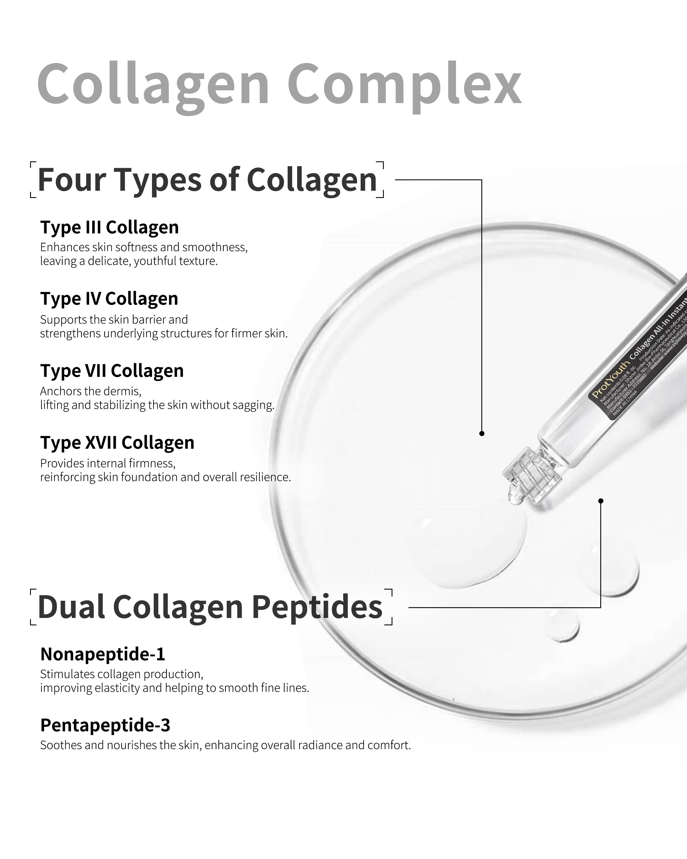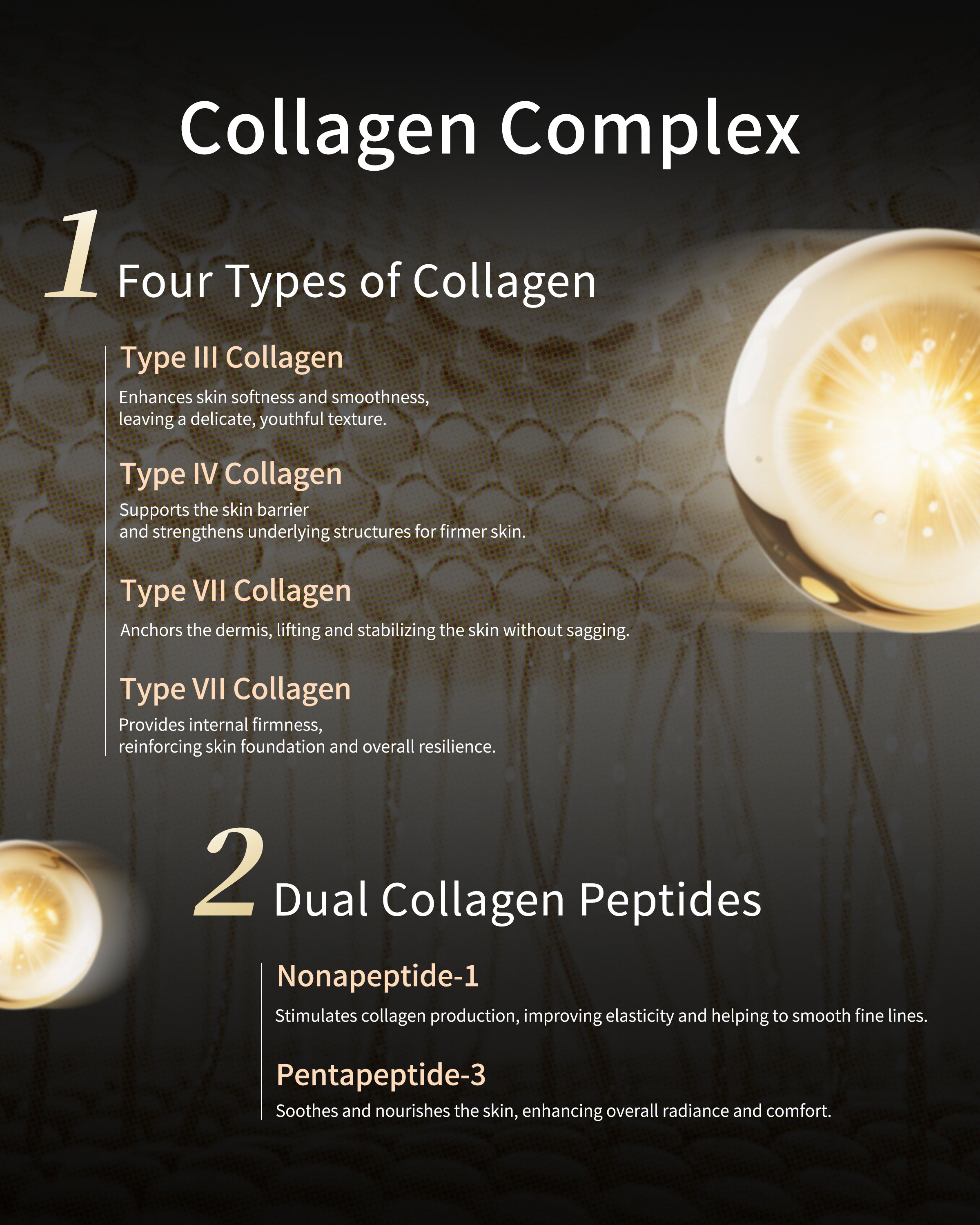 Advanced Collagen Complex:Combines four types of collagen (Type III, IV, VII, XVII) with Nonapeptide-1 and Pentapeptide-3 for comprehensive skin energizing, elasticity, and firmness.